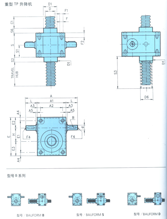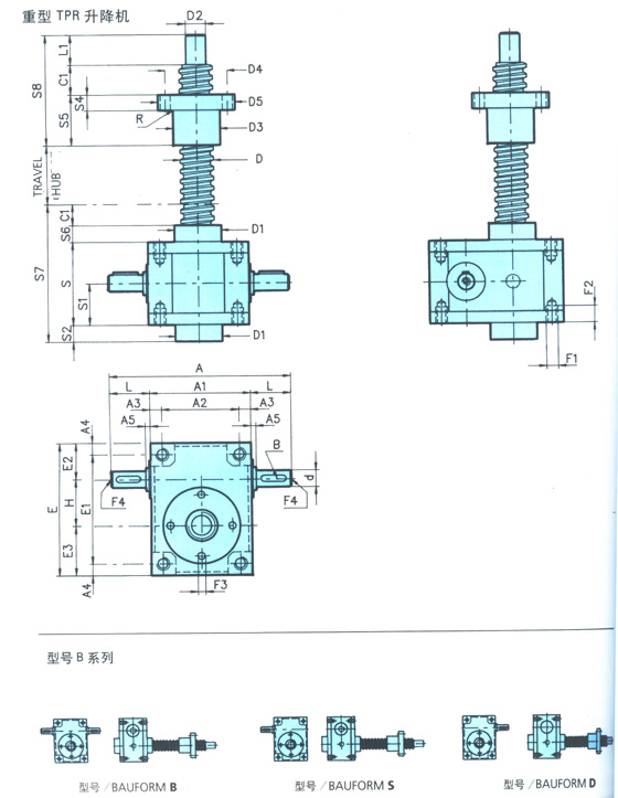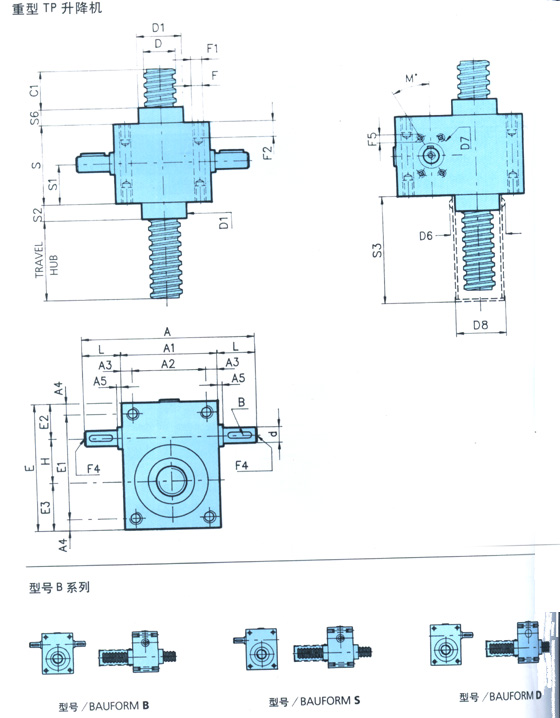 TP機械絲杠升降機操作簡單,可靠性強,低維修率等優點,使螺旋千斤頂有著廣闊的應用范圍.TP螺旋升降機配有自動連鎖機構,即他們能支撐自身重量而不必采用閘或其它鎖定系統.千斤頂可單獨使用也可與軸、聯軸節,傘齒輪傳動器結合共同使用。他們可由交流或直流電機驅動,也可由液壓或氣壓電機驅動,他們可手動驅動也可用其它傳動形式。TP軸向運動螺桿。驅動軸旋轉帶動蝸輪并產生螺桿的軸向直線運動。螺桿必須有抗旋轉功能;TPR配備旋轉歸納法桿與支撐螺母,驅動軸旋轉帶動蝸輪旋轉。蝸輪與螺桿連接,因而也帶動螺桿旋轉。支撐螺每間把螺桿的旋轉運動轉變成直線運動。支撐螺母必須具有抗旋轉功能。為滿足用戶的廣泛需要,本公司可提供各種螺桿頭,也可按用戶要求定做,TP也可按用戶要求定作千斤頂以滿足用戶特殊機器的特殊要求,產品各大系列均采用雙導軌,確保升機能在最惡劣的條件下發揮最佳工作效能。特殊的密封技術使蝸桿,蝸輪體系能長期在良好的潤滑狀態下運轉。
