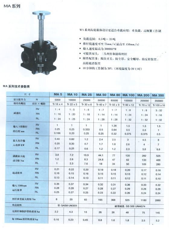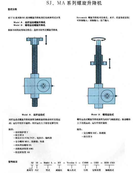 | SJ、MA系列蝸輪絲桿升降機屬于多安裝面絲桿升降機,應用更加方便,體積更加小巧,適用于各個行業。 |