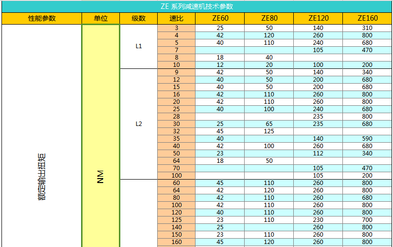 為方形法蘭設計,安裝尺寸簡單方便。型號分:ZE40、60、90、120、160、200機座型號。速比:1-1000有19種比速可選擇;分一、二、三級變減速傳動;精度:一級傳動精度在6-8弧分,二級傳動精度在8-10弧分,三級傳動精度12-15弧分;等1000多種規格。
