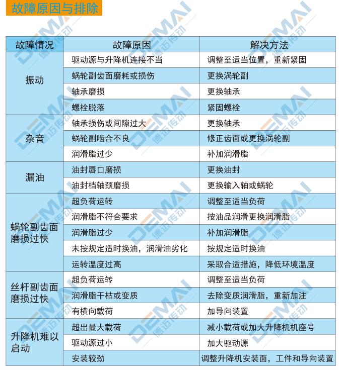 絲桿升降機做為一種機械,在使用過程中不論是操作不當還是使用環境等問題,難免會出現一些故障。今天我們德邁傳動就來跟大家說一下容易出現的故障以及如何解決這些問題。