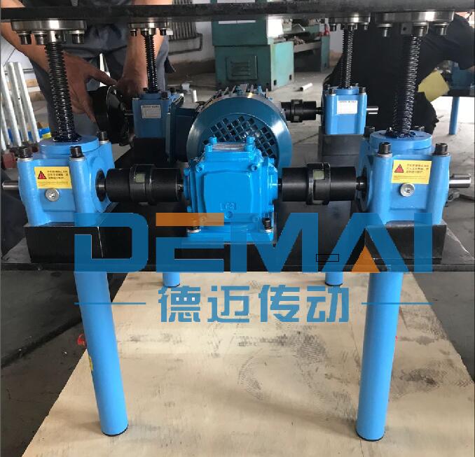 這種平臺由一臺電機驅動,兩個輸出軸帶動兩臺轉向箱,來驅動四臺絲桿升降機。這四臺升降機安裝面在底部,絲桿頭部是法蘭接盤,用來和上面的平臺連接,固定。這是一種常見的聯動形式,而且由于梯形絲桿升降機的自鎖性,所以整套方案是具備自鎖性的。