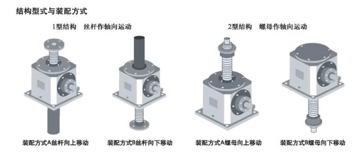 它的結構形式同樣分為絲桿運動還有螺母運動,每種形式又分為舉升和提升運動,裝配形式很靈活,規格分為2.5、5、15、20、25、35、50×10KN,傳動比分為快速慢速兩種。絲桿的防護分為基本型,防旋轉型,帶防護罩型。下圖是SL錐齒輪絲桿升降機的頭部形式與裝配形式。