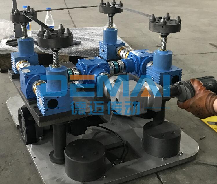 滾珠絲桿升降機同樣可以多臺聯動使用,今天我們就四臺聯動的方案和大家講一下滾珠絲桿升降機搭配伺服電機的優勢。讓廣大機械工程師對于方案的設計有更多的思路和想法。 如圖所示,整個方案采用的是四臺滾珠絲桿升降機聯動,升降機采用絲桿運動形式,并且頭部配有法蘭接盤。升降機通過聯軸器和轉向箱連接在一起。為了保證升降機與轉向箱在同一水平線上,我們使用了升降機加裝安裝板來實現。由于客戶對于精度有著極高的要求,我公司生產的升降機精度就很高,再加上我們在驅動源的選擇上,為其選了精度更高的伺服電機,以及精密行星減速機,這樣整套方案的精度可到0.05mm之內,讓客戶非常滿意。